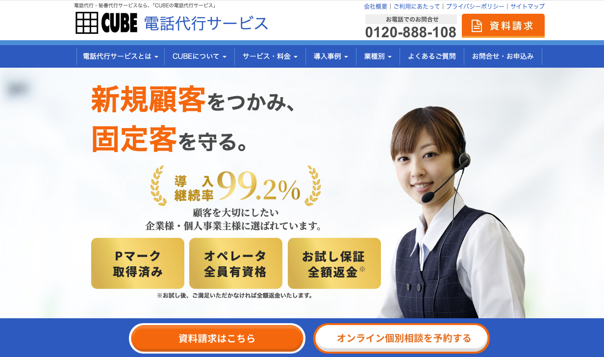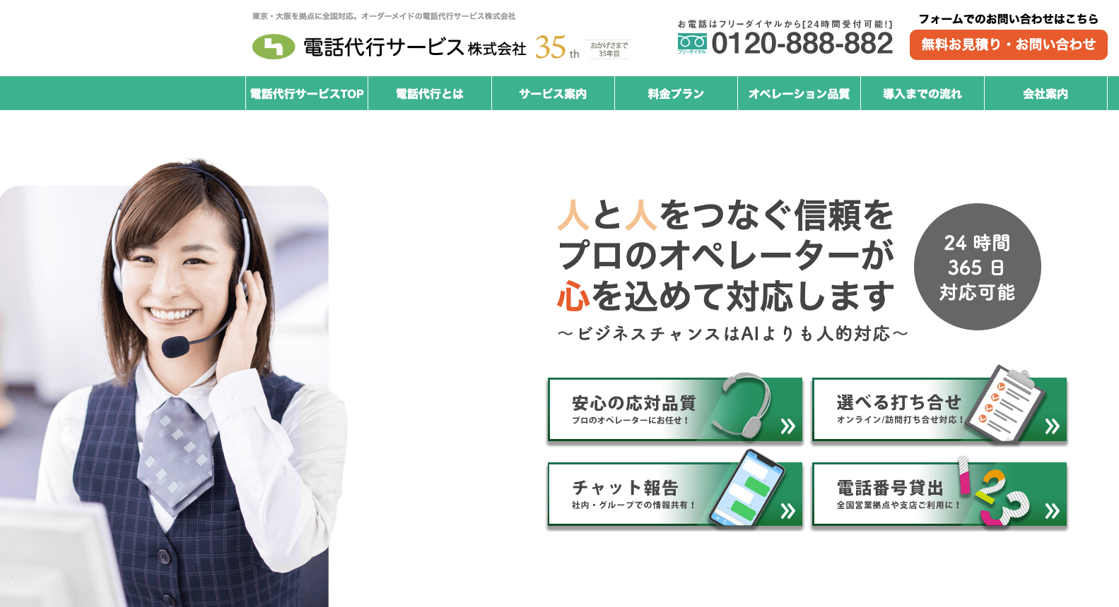 | 月額料金(税別) | ¥7,000〜(電話受付代行) / ¥30,000〜(夜間休日代行) / ¥25,000〜(コールセンター代行) |