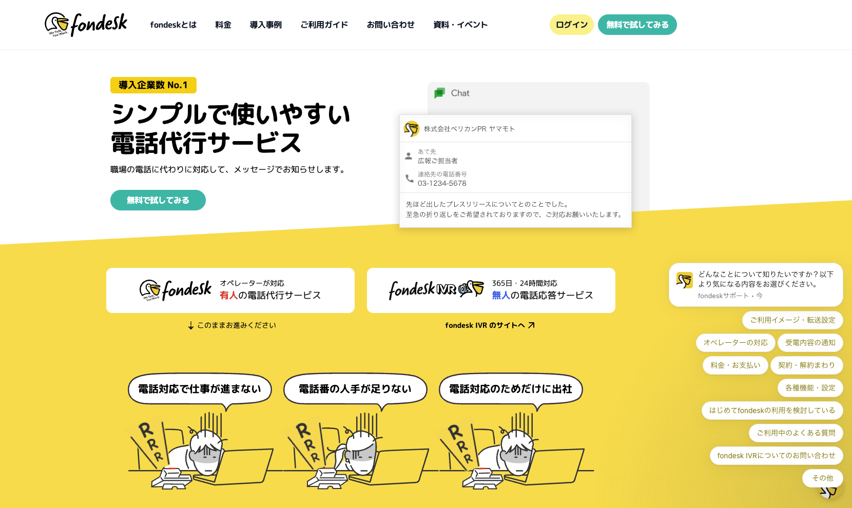 業種別プランが充実しており、士業・不動産・ECサイト・求人受付など、専門知識が求められる分野に対応したシナリオを各業種別に整備しています。報告・連携ツールはSlack・Chatwork・LINE・LINE WORKS・Microsoft Teams・Google Chatの主要ツールに対応。全国主要都市での電話番号貸し出しサービスも提供しています。